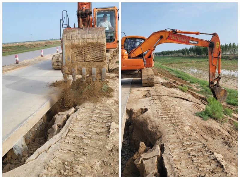 工作组奔赴总干渠受损严重区域,对渠堤沿线及闸区工程设施进行拉网式排查,详细记录损毁位置、面积、程度,并根据摸排结果,制定修复方案,明确责任分工、施工标准和时间节点,将修复任务分解到组、落实到人。随着指令下达,枢纽所迅速调集挖掘机等机械配合人力有序作业,枢纽所职工冒高温、战酷暑,紧张而有序地开展工程设施防渗处理、雨淋坑填垫、边坡修整等工作。