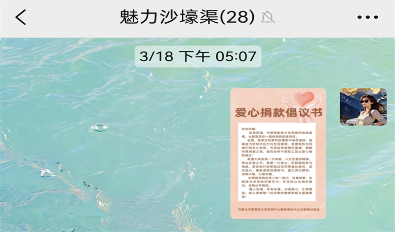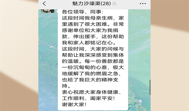 “一方有难,八方支援”。试验站党支部得知情况后,立即启动帮扶机制,向全体职工发出爱心捐款倡议。倡议书发出后,迅速得到积极响应,全站上下爱心如潮:站领导率先垂范带头捐款,各股室职工踊跃参与,无论是深耕多年的老员工,还是初入岗位的青年同志,无论是现任同事,还是已离开试验站的老友,纷纷伸出援手。点滴积蓄汇成暖流,每一笔捐款都承载着对同事及其家庭的深切牵挂,每一份爱心都凝聚着试验站的深情厚谊与大义担当。