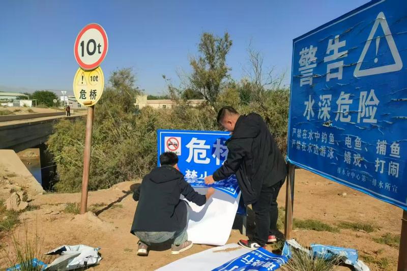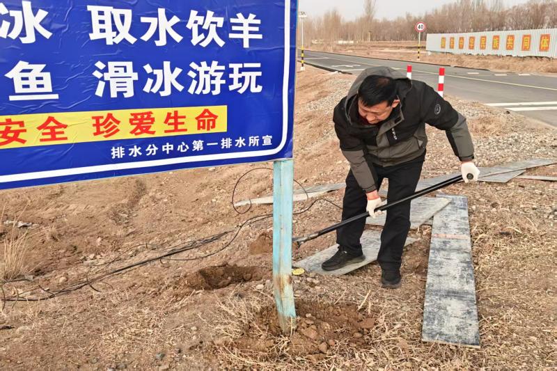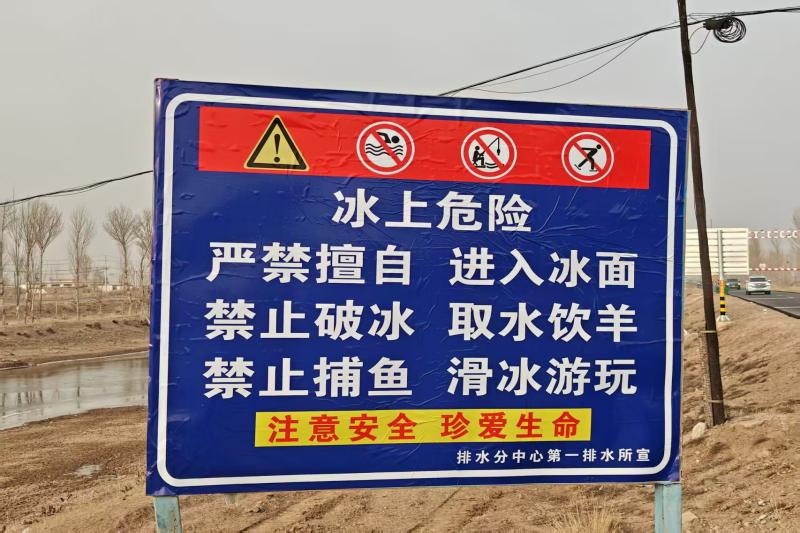 第一排水所紧盯两类核心风险点精准发力。针对冬季总排干河面结冰,放假学生在冰上玩耍以及附近群众破冰饮羊、捕鱼极易造成安全事故,第一排水所在人流、车流集中的重点段落,规范布置了14块1.5X1.2米的“冰上危险”、“严禁擅自进入冰面”、“禁止破冰取水饮羊、捕鱼,滑冰游玩”的警示牌。