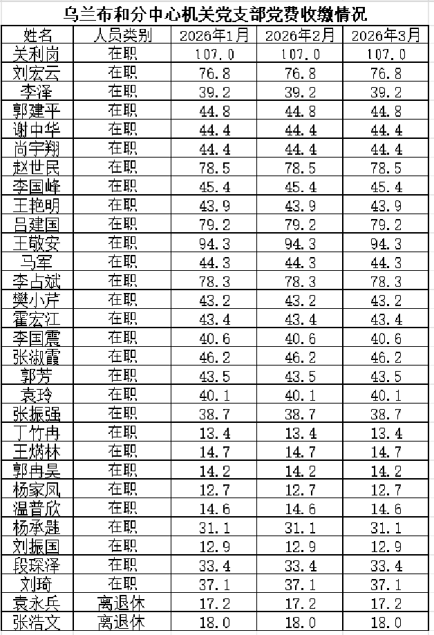 乌兰布和分中心机关党支部一季度党费收缴情况