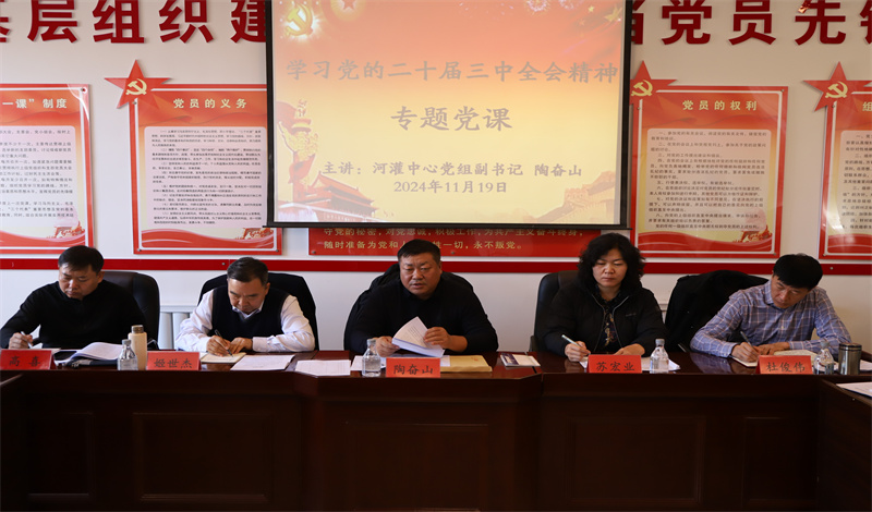 在塔布干渠供水所,陶奋山书记以学习贯彻党的二十届三中全会精神为主题,从学习领会全会意义、全面准确理解《决定》提出的进一步全面深化改革重大举措、指导推动灌区发展三个方面宣讲了党的二十届三中全会精神,并强调干部职工要认真开展学习活动,持续在深入学习、强化理论指导上下功夫,进一步丰富和完善宣传引导方式,提升教育培训实效,充分发挥好党建工作的指导引领作用。