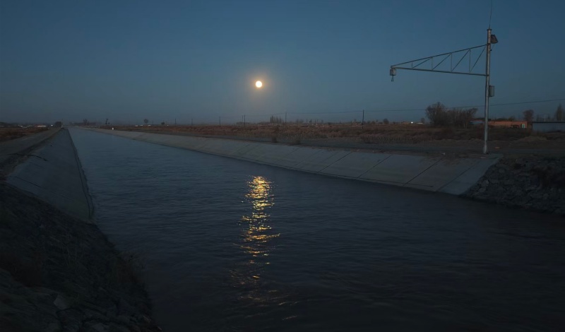 夜晚的灌区,格外安静。渠水已渐渐凝结成厚实的冰面,只在深处还残留着一丝微弱的水流声,像是秋灌最后的絮语。月光洒在冰面上,泛着清冷的光泽,照亮了渠岸的草木与田垄。