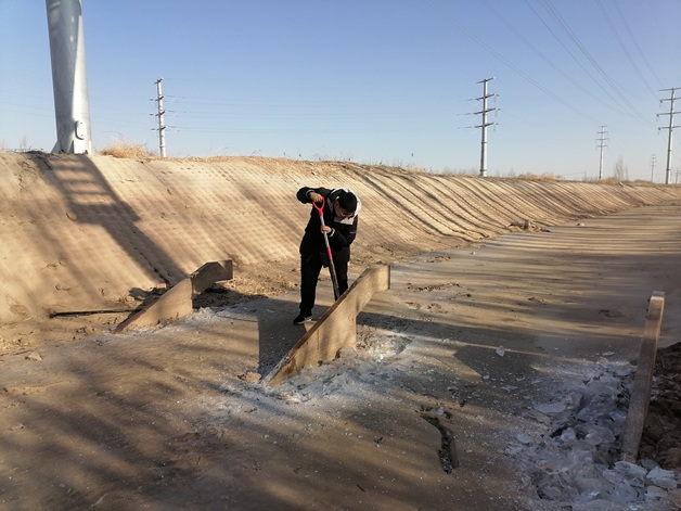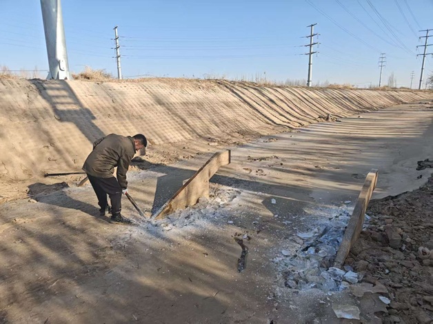 “测流设备的精准度就是灌溉供水的‘生命线’,冬季破冰作业必须精准高效,既要清除隐患,又要避免损伤设备。” 在永济灌域各测流断面,职工们身着厚重衣服,手持破冰镐、冰铲等工具,对设备周边2米范围内的坚冰进行清理。由于冰层坚硬且设备精密,所以采用 “先破冰、后清渣” 的流程,先用破冰镐在冰层上划开网格状裂缝,再用冰铲将碎冰逐一清理至渠道外侧,确保破冰过程中传感器、线缆等关键部件不受碰撞、挤压。