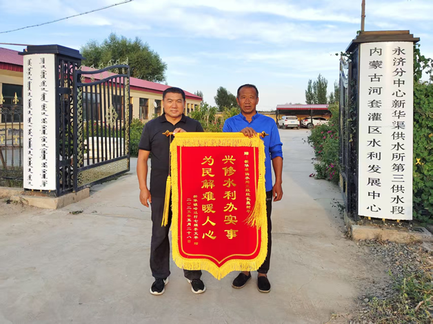 近期,新华渠供水所第三供水段洋溢着温馨氛围,农户李文平将一面绣有“为民解难暖人心”的锦旗郑重地赠予三段段长聂树平,以此表达对其敬业工作的深切感激。