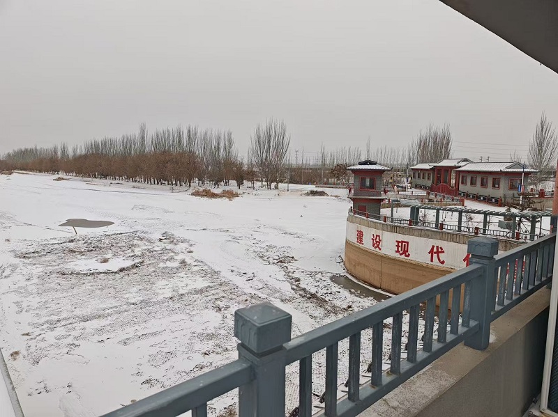 红墙沿着渠堤蜿蜒,墙根的枯草半埋在雪里,偶有几只麻雀落在枝头,抖落一身雪粒,又扑棱着翅膀飞向闸楼。雪落满了屋顶,墙体与白雪相融,在苍茫的天地间立成了地标。值班的同事踩着雪路走过,脚印在雪地上碾出深浅的痕迹,他们的身影在空旷的闸区里显得渺小,却又带着一种守护的坚定。